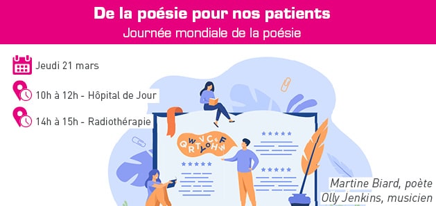 Martine Biard, poète, viendra lire des textes de sa composition, en co-production avec le musicien et chanteur Olly Jenkins, en salle d’attente de l’Hôpital de jour, de 10h à 12h, puis dans le service de radiothérapie, de 14h à 15h.