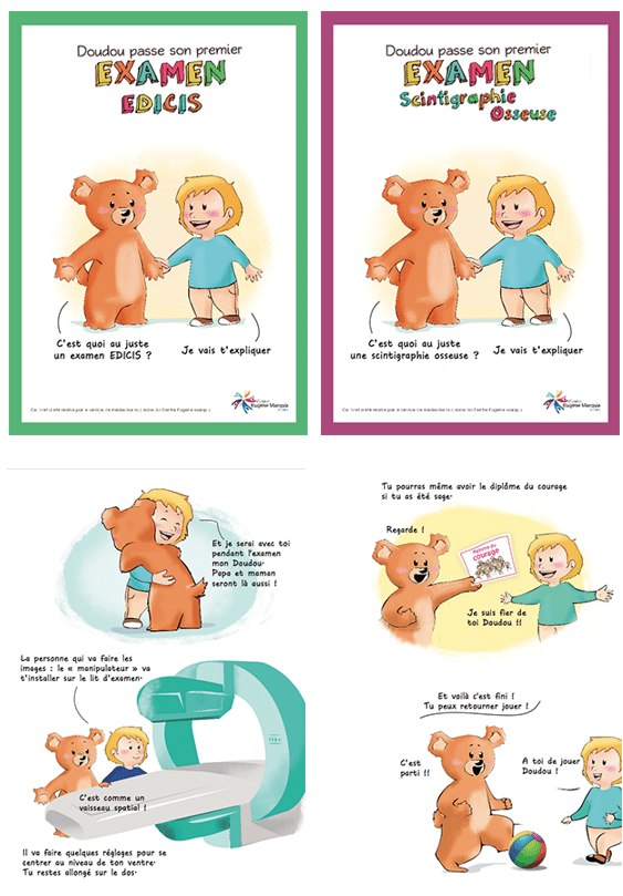 Océane Bagot du service communication pour les illustrations et moi-même pour les textes sommes à l’origine de la conception de livrets à destination des enfants, pour les aider à comprendre et appréhender comment se passent les différents examens en médecine nucléaire. Ces livrets servent bien sûr également aux parents ou aux services prescripteurs qui ne connaissent pas forcément bien ce type d’examens. Il s’agit en effet d’examens spécifiques et peu courants qui consistent à injecter en intraveineuse un médicament associé avec un produit radioactif qui va se fixer sur tel ou tel organe selon ce que l’on souhaite visualiser. Il est nécessaire de bien expliquer la phase de l’injection qui est souvent un moment redouté chez les enfants et, en outre, nous nous servons d’appareils qui sont assez imposants donc impressionnants pour les enfants, et c’est intéressant qu’ils puissent se préparer en voyant des images de la machine dans le livret.