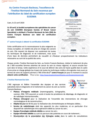 Caen, le 22 avril 2020 – Ce 20 avril, la Société européenne des spécialistes du cancer du sein EUSOMA (European Society of Breast Cancer Specialists) a attribué à l’Institut Normand du Sein (INS) du Centre François Baclesse son label de certification européen.