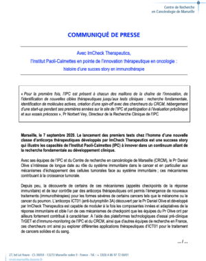 Les brevets protégeant ces découvertes et co-détenus par l’IPC, l’Inserm, le CNRS & l’Université d’Aix-Marseille ont permis la création d’ImCheck Therapeutics en 2015. Financée par plusieurs investisseurs européens et américains de premier rang, la société de biotechnologie marseillaise vient de lancer les premiers essais cliniques avec ICT01 dans plusieurs centres d’investigations en Europe. L’IPC participe à ces essais et a récemment inclus les premiers patients dans l’étude conduite par son unité ETOH dédiée aux essais de phase précoce avec le support du Département de la recherche clinique et de l’innovation. L’IPC démontre ainsi pleinement ses capacité d’innovation thérapeutique et sa volonté d’accompagnement de projets prometteurs dans la lutte contre le cancer en favorisant le rapprochement entre recherche fondamentale, développement pré-clinique, conduite d’essais cliniques et émergence d’acteurs de la biotechnologie.