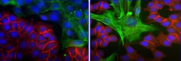 Les cellules tumorales ne sont en effet pas isolées au sein de l’organisme. Elles interagissent avec leurs voisines, à priori saines et les utilisent même à leurs fins. Parmi elles, les fibroblastes sont des cellules de soutien qui forment la trame de tous les tissus. Ils peuvent être activés par des signaux émis par les cellules tumorales. On les désigne alors sous le nom générique de « fibroblastes associés au cancer » (CAF). Les CAFs constituent la population de cellules la plus abondante présente au cœur des tumeurs, se mélangeant avec les cellules tumorales.