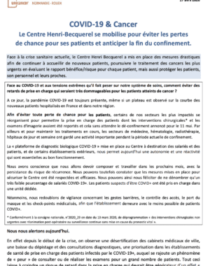 Nous souhaitons aujourd’hui réaffirmer à nos patients et à leurs médecins, en cours de prise en charge et aux nouveaux cas, d’être vigilants à maintenir les prises en charge en cancérologie afin d’éviter toute perte de chance. La balance bénéfice/risque continuera d’être évaluée pour chaque patient.