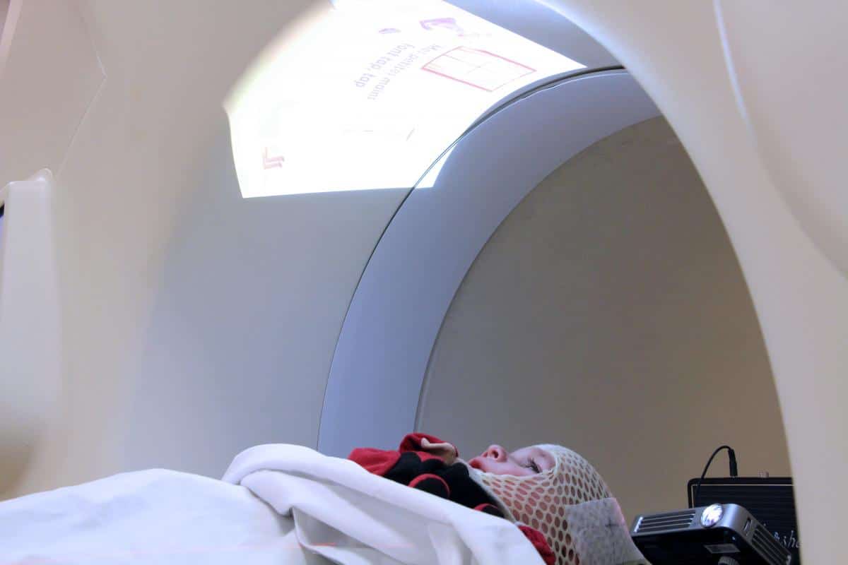 Grâce au vidéoprojecteur et à une enceinte, un film est projeté sur le plafond du tunnel pendant tout le traitement et le jeune patient peut ainsi se concentrer sur ce qu’il voit.