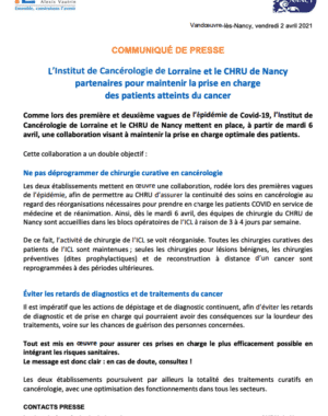 Les deux établissements mettent en oeuvre une collaboration, rodée lors des premières vagues de l’épidémie, afin de permettre au CHRU d’assurer la continuité des soins en cancérologie au regard des réorganisations nécessaires pour prendre en charge les patients COVID en service de médecine et de réanimation. Ainsi, dès le mardi 6 avril, des équipes de chirurgie du CHRU de Nancy sont accueillies dans les blocs opératoires de l’ICL à raison de 3 à 4 jours par semaine.