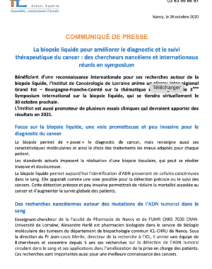 Bénéficiant d’une reconnaissance internationale pour ses recherches autour de la biopsie liquide, l’Institut de Cancérologie de Lorraine anime un réseau inter-régional Grand Est – Bourgogne-Franche-Comté sur la thématique et co-organise le 3ème Symposium international sur la biopsie liquide, qui se tiendra virtuellement le 30 octobre prochain.