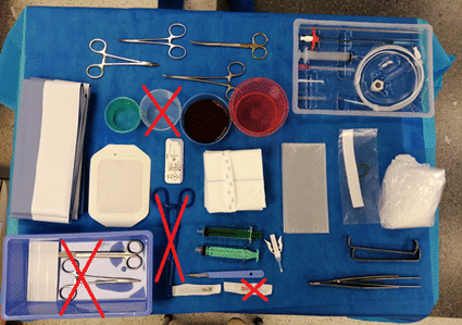 Optimisation des kits stériles, modification du contenu des boites à instruments permettant de réduire leur nombre, les équipes du bloc ont réalisé une diminution de la quantité de matériel médical employé quotidiennement.