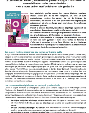 Lancée le 16 juin prochain, la campagne « On a toutes un bon motif de faire son suivi gynéco ! » invite donc toutes les femmes à s’informer, à consulter et à se faire dépister via le « Challenge Cancers Féminins » partagé sur les réseaux sociaux et à retrouver sur : www.cancersfeminins.centreoscarlambret.fr