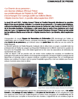 Le jeudi 29 avril 2021, l’artiste Arnaud Théval et l’Institut Bergonié dévoileront la première étape d’une oeuvre globale, intitulée « Le chemin de sa personne ». Ce vaste projet artistique, culturel et architectural mis en place dans et avec le Centre de Lutte Contre le Cancer (CLCC) de la Nouvelle-Aquitaine, à Bordeaux, a été mené dans le cadre d’une résidence qui a duré près de 4 ans. Il a également fait l’objet d’un travail d’écriture d’Arnaud Théval qui est publié par les éditions Dilecta sous le titre de « Hôpital cherche Nord » (en librairie, début septembre 2021).
