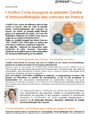 Le centre de lutte contre le cancer parisien, l’Institut Curie, vient de créer le premier Centre d’immunothérapie des cancers en France. Ce centre, en grande partie financé grâce à la générosité du public, est l’une des réalisations majeures de l’Institut dans le cadre de son projet d’entreprise MC21.