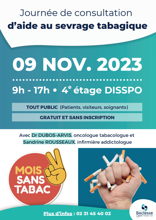 À l’occasion du Mois Sans Tabac, le Centre François Baclesse de Caen organise une journée ouverte de consultation tabacologique gratuite, ouverte à tous (patients, accompagnants, visiteurs et salariés) et sans inscription. Cette journée qui aura lieu de 9h à 17h le jeudi 9 novembre a pour but d’informer sur l’aide et l’initiation au sevrage tabagique.