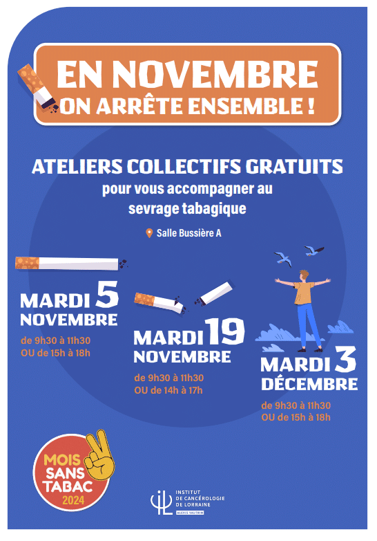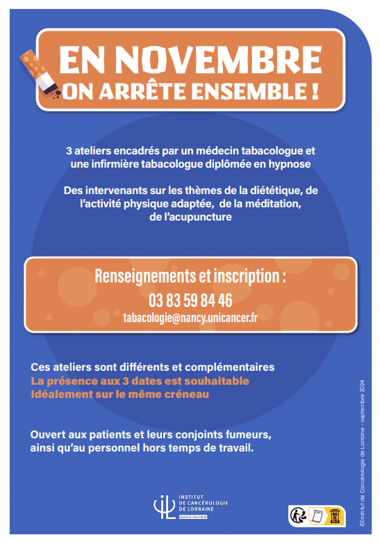 L’Institut de Cancérologie de Lorraine (ICL) se mobilise également dans le cadre de Mois Sans Tabac au travers d’ateliers collectifs gratuits pour accompagner au sevrage tabagique.