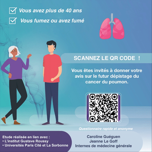 Gustave Roussy propose plusieurs actions dans le cadre de Mois Sans Tabac. Tout d’abord, au travers d’un flyer invitant les personnes de plus de 40 ans, fumeurs ou anciens fumeurs, à donner leur avis sur le futur dépistage du cancer du poumon.