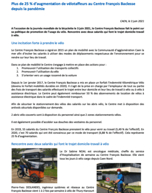 En 2019, 55 salariés du Centre François Baclesse prenaient le vélo pour venir au travail (5,49 % de l’effectif). En 2020, c’est 70 salariés qui ont été convaincus par ce mode de transport (6,88 % de l’effectif). Cela représente 25 % d’augmentation.