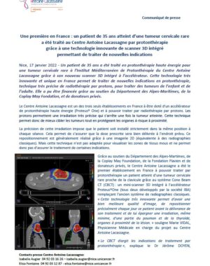 Un patient de 35 ans a été traité en protonthérapie haute énergie pour une tumeur cervicale rare à l’Institut Méditerranéen de Protonthérapie du Centre Antoine Lacassagne grâce à son nouveau scanner 3D intégré à l’accélérateur. Cette technologie très innovante et unique en France permet de traiter de nouvelles indications en protonthérapie, technique très précise de radiothérapie par protons, pour traiter des tumeurs de l’enfant et de l’adulte. Elle a pu être financée grâce au soutien du Département des Alpes-Maritimes, de la Coplay May Fondation, de la Fondation Flavien et de donateurs privés.