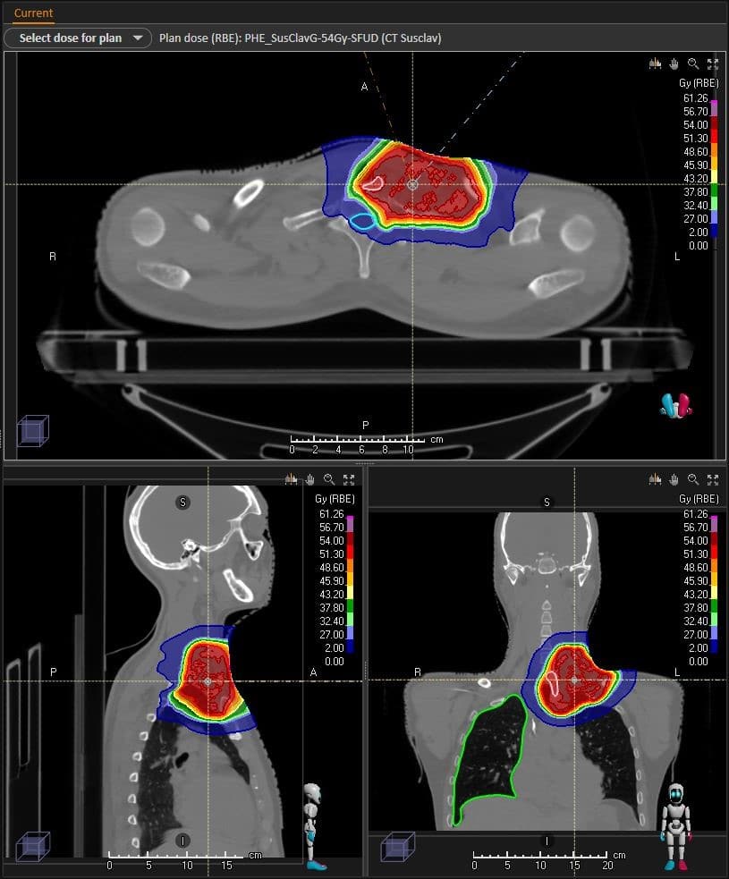 Grâce au soutien du Département des Alpes-Martimes, de la Coplay May Foundation, de la Fondation Flavien et de donateurs privés, le Centre Antoine Lacassagne a été le premier établissement en France à pouvoir traiter par protonthérapie un patient atteint d’une tumeur cervicale rare proche de la clavicule grâce au système Cone Beam CT (CBCT) : un mini-scanner 3D intégré à l’accélérateur Proteus®One (tous deux développés par la société IBA) remplaçant l’ancien système de radiographies classiques. « Cette technologie très innovante permet d’avoir une bien meilleure qualité d’image, de repositionner précisément chaque jour ce patient avant la délivrance de son traitement et de lui épargner une irradiation, même minime, d’une partie du poumon et de la thyroïde, organes à proximité de la lésion. » souligne Marie VIDAL, Physicienne Médicale en charge du projet au Centre Antoine Lacassagne.