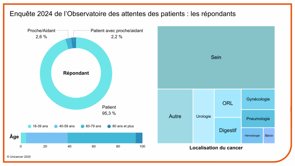 Parmi ces répondants, 95,3 % sont des patients eux-mêmes et la majorité a entre 60 et 79 ans. Le questionnaire a été adressé quelle que soit la localisation du cancer, mais plus de la moitié des répondants étaient atteints d’un cancer du sein.