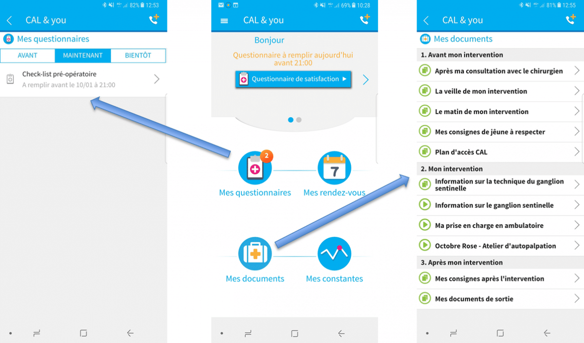 L’application est téléchargée par la patiente lors de la programmation chirurgicale. Avant l’intervention, elle lui permet d’avoir accès à des vidéos explicatives sur son intervention et sur les différentes étapes de sa prise en charge, de pouvoir suivre ses rendez-vous et de s’assurer de n’avoir rien oublié avant le jour J. Après l’intervention, elle est un outil interactif entre la patiente et l’équipe soignante. En effet, grâce à des questionnaires, la patiente peut donner des nouvelles de son état de santé à l’équipe, qui les visualise en direct sur des écrans à l’hôpital et peut réagir.
