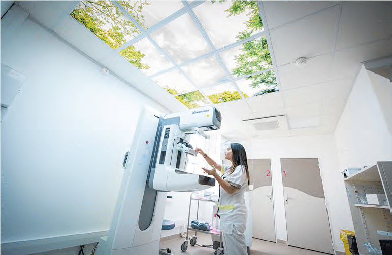 Se faire dépister ou effectuer un examen diagnostique peut être source d’anxiété. Tout a donc été pensé pour limiter le stress et accentuer la sensation de bien-être. L’entrée est dorénavant indépendante de l’hôpital. Puis les différents espaces, qu’il s’agisse des salles d’attente, des couloirs ou des salles d’examen, sont colorés, lumineux et apaisants. Par exemple, dans la salle de mammographie, le plafond est en réalité un ciel lumineux.