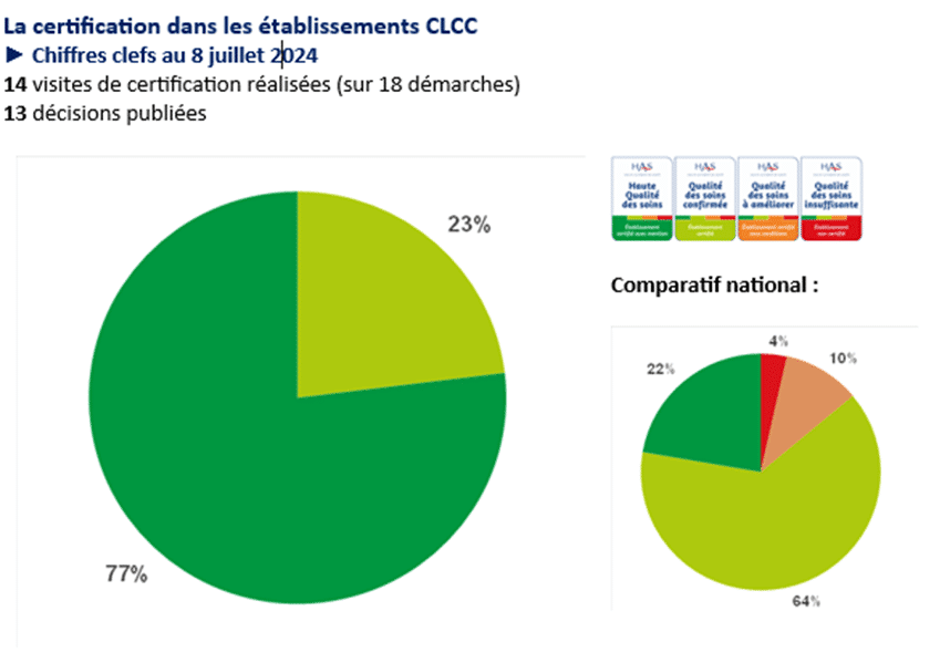 13 Centres de lutte contre le cancer et 1 Centre associé certifiés par la HAS dans le cadre de nouvelle certification, dont 11 certifiés « Haute qualité des soins » en 2023 et 2024