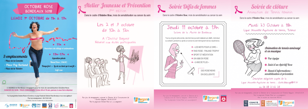 JEUDI 11 OCTOBRE / 19H : « Soirée Défis de femmes » : Tout au long de cette soirée, des femmes qui ont relevé un défi individuel ou collectif après un cancer du sein, témoignent de leur expérience. Salons de la Mairie de Bordeaux.