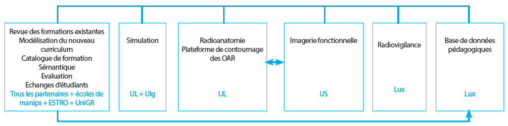 En particulier, 5 axes doivent permettre de sécuriser le parcours patient : apprentissage par simulation, plateforme d’e-learning en radionatomie/contourage des organses à risque, définition de nouvelles structures fcontionnelles, amélioration de la communication interpersonnelle, développement d’un outil des toxicités et d’une mégabase de données pédagogiques partagée.