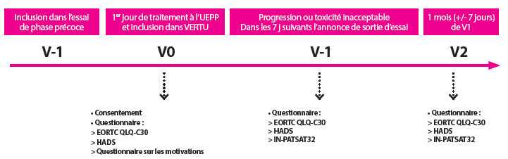 L’objectif principal est d’estimer la prévalence de détresse psychologique lors de l’annonce de la sortie d’essai chez des patients sortant d’un essai clinique de phase I ou II à l’UEPP pour toxicité inacceptable ou progression de la maladie. Cette étude permettra aussi de décrire l’évolution (inclusion V0)), sortie d’essai (V1), et un mois après sortie d’essai (V2) de la détresse psychologique des patients sortant d’un essai clinique de phase I ou II, de personnaliser les soins de support, d’évaluer la satisfaction des patients et de décricre l’impact des sorties d’essais sur les équipes de soin.