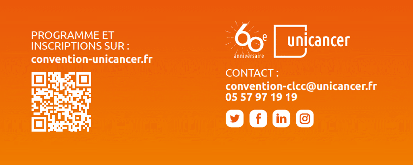 - Une journée Recherche & Données en cancérologie dédiée à la présentation de la stratégie Unicancer et des programmes emblématiques portés par la Direction de la Recherche et du Développement , et la Direction des Datas et des Partenariats avec les CLCC : Jeudi 14 novembre de 8 h 30 à 17 h