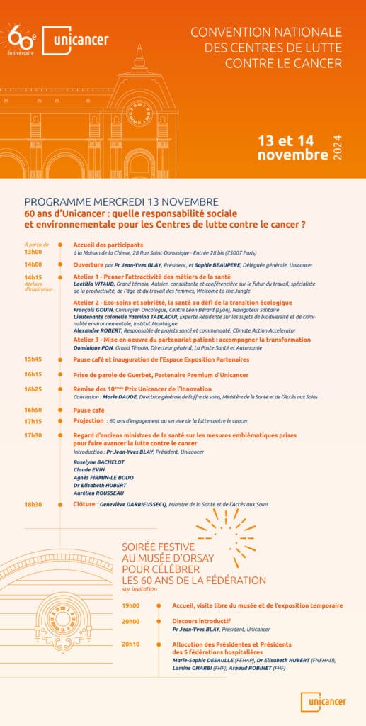 - Les 60 ans d’Unicancer, marqués par la remise des 10èmes Prix Unicancer de l’Innovation et par la présence d’anciens ministres invités à partager les mesures emblématiques portées en faveur de la lutte contre le cancer : Mercredi 13 novembre de 17 h à 18h30,