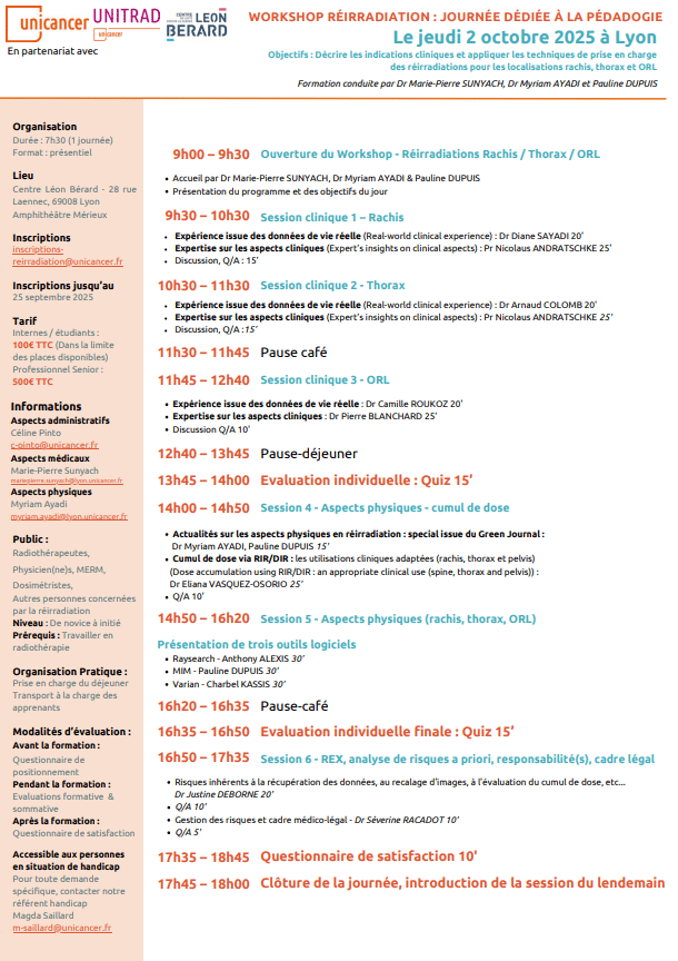 Cette première journée sera consacrée à l’enseignement des indications cliniques et à la mise en pratique des techniques de prise en charge des réirradiations pour trois localisations prioritaires : rachis, thorax et ORL.