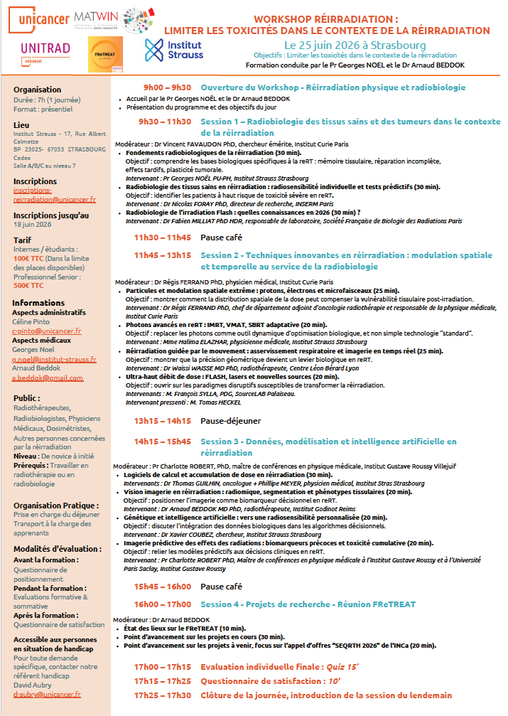Cette nouvelle journée sera consacrée à la radiobiologie des tissus sains dans le contexte de réirradiation ainsi qu’aux perspectives cliniques et stratégiques. Les techniques innovantes en réirradiation seront également présentées : IMRT, VMAT, SBRT adaptative, asservissement respiratoire ou encore la radiothérapie FLASH.