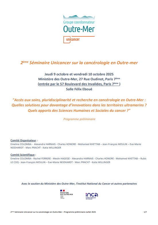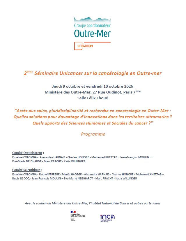 Venez assister à une nouvelle édition du séminaire Unicancer sur la cancérologie en Outre-mer au Ministère des Outre-Mer à Paris les jeudi 9 et vendredi 10 octobre prochains (entrée par le 27 Rue Oudinot, Paris 7ème – salle Félix Eboué) !